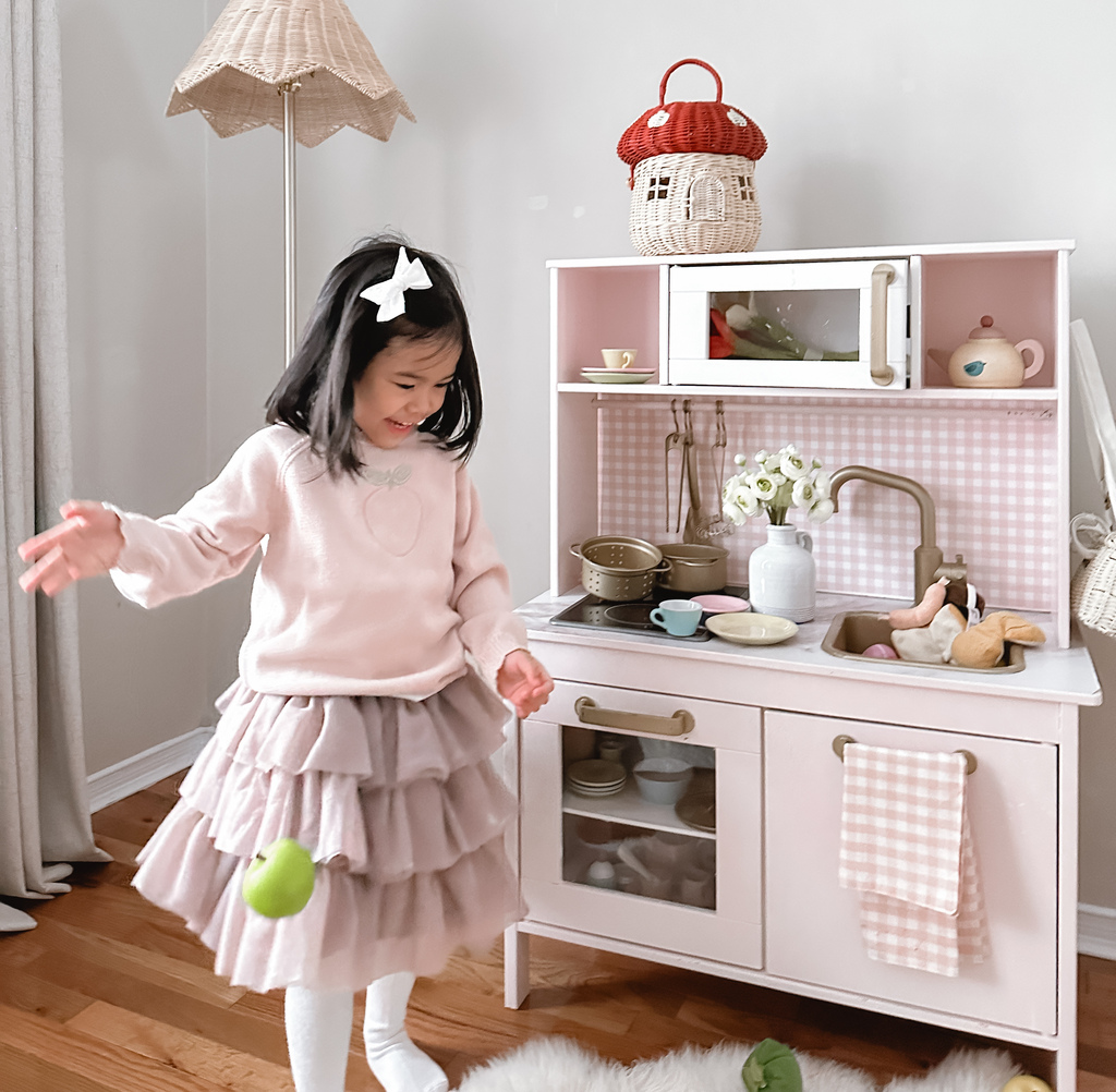 This little play kitchen is absolutely charming and a perfect spot for imaginative play.